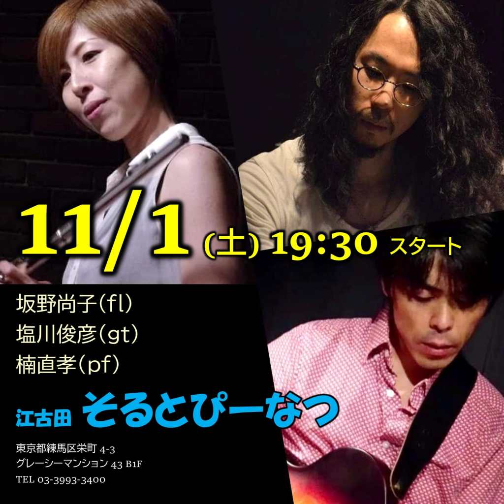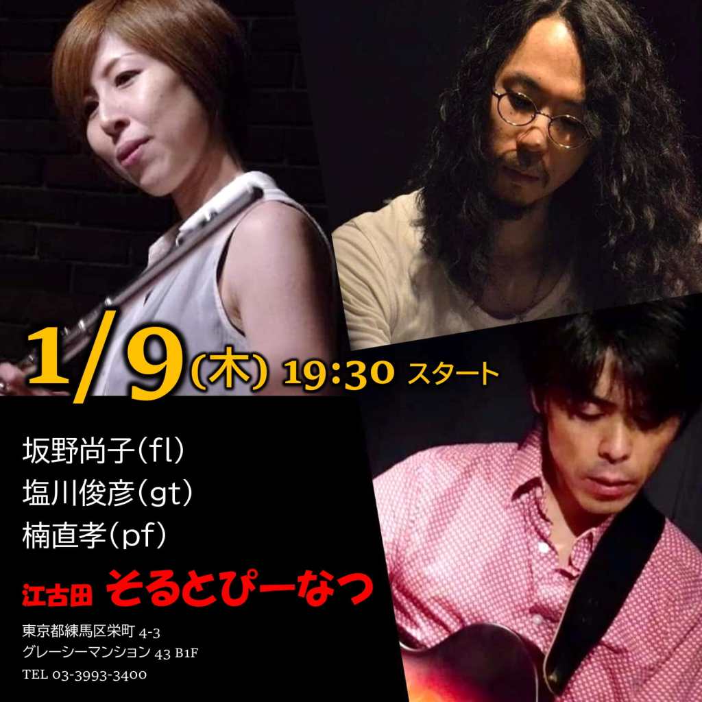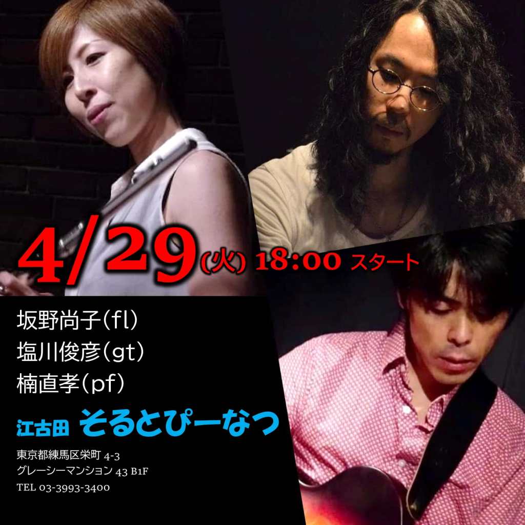 4月29日(火・祝) 江古田『そるとぴーなつ』 18:00スタート 2セット MC¥1500 TC¥500 坂野尚子(fl) 塩川俊彦(gt) 楠直孝(pf) 東京都練馬区栄町 4-3 グレーシーマンション43(B1F) 電話 03-3993-3400https://saltpeanuts.jp/ GWの入り口?!祝日 のライブです 普段より少し早い18:00スタート! 回を重ねている同い年のトリオです フルートとギターとピアノという、あまりやらない編成?かもしれませんが、それぞれの個性もアンサンブルも楽しんでいただける、なかなか面白いトリオです スタンダードをわいわいやったり、かっこいいジャズメンオリジナルをやったり、ちょっとマニアックな曲もやったり? 音環境も良く、リーズナブルでじっくりライブを楽しめるそるとぴーなつ ぜひご来店くださいませ
