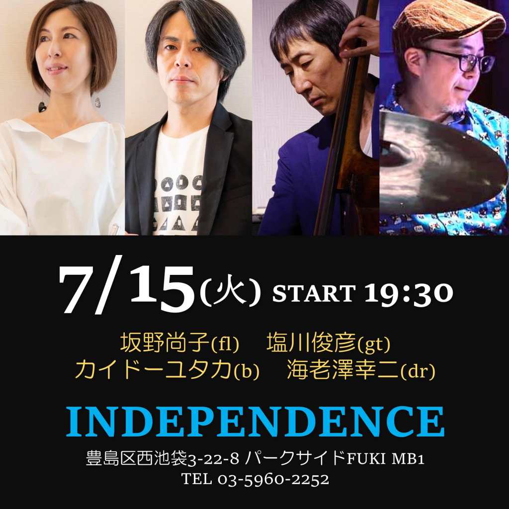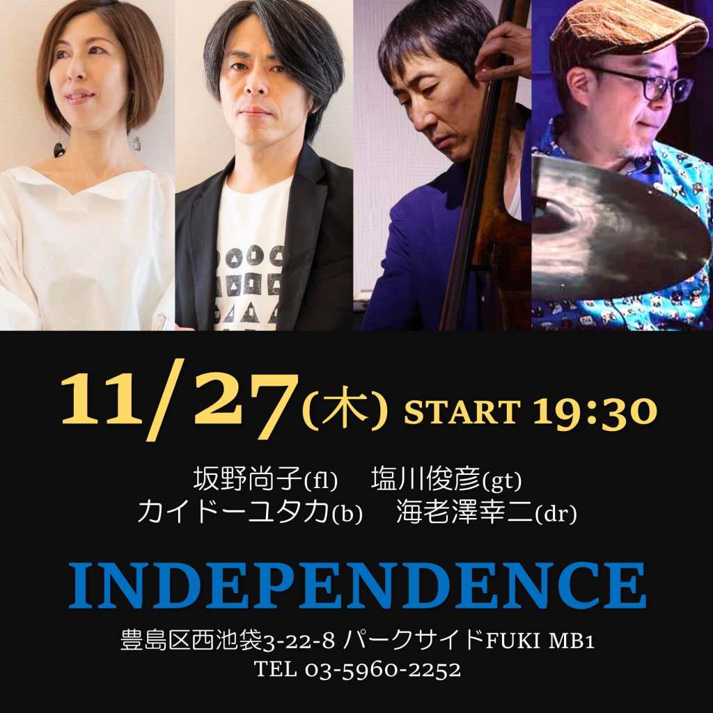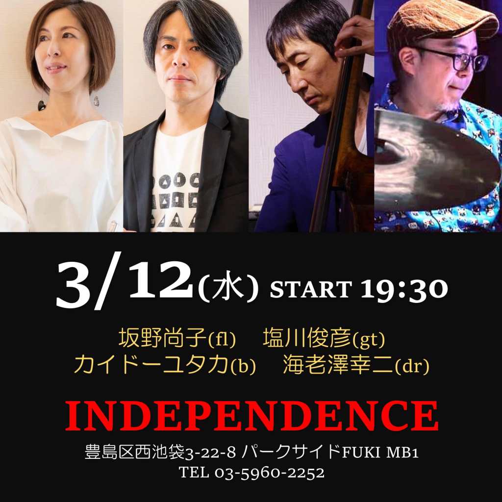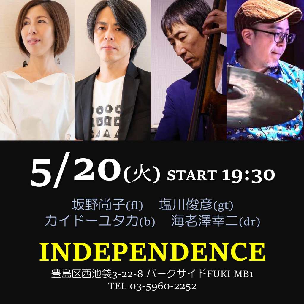 5月20日(火) 池袋『INDEPENDENCE』 19:00オープン 19:30スタート 2ステージ MC¥3000 坂野尚子(fl) 塩川俊彦(gt) カイドーユタカ(b) 海老澤幸二(dr) 東京都豊島区西池袋3-22-8 パークサイドFUKI MB1 電話 03-5960-2252http://jazz-independence.com/ 隔月レギュラー、インディペンデンス限定のカルテットです! お馴染みのメンバーとの演奏活動も長くなってまいりました😄 ちょっと濃いぃめのジャズメンオリジナル、スタンダード、モンクやショーターやエバンスやマイルスや、、、(笑)ジャズファン好みのかっちょいい曲もいろいろやります✨ フルートカルテットらしからぬなかなか骨太な選曲、バンドメンバーの個性もアンサンブルも楽しんでいただけるかっこいいバンドです😁 未体験なみなさまもお気軽にぜひ✨