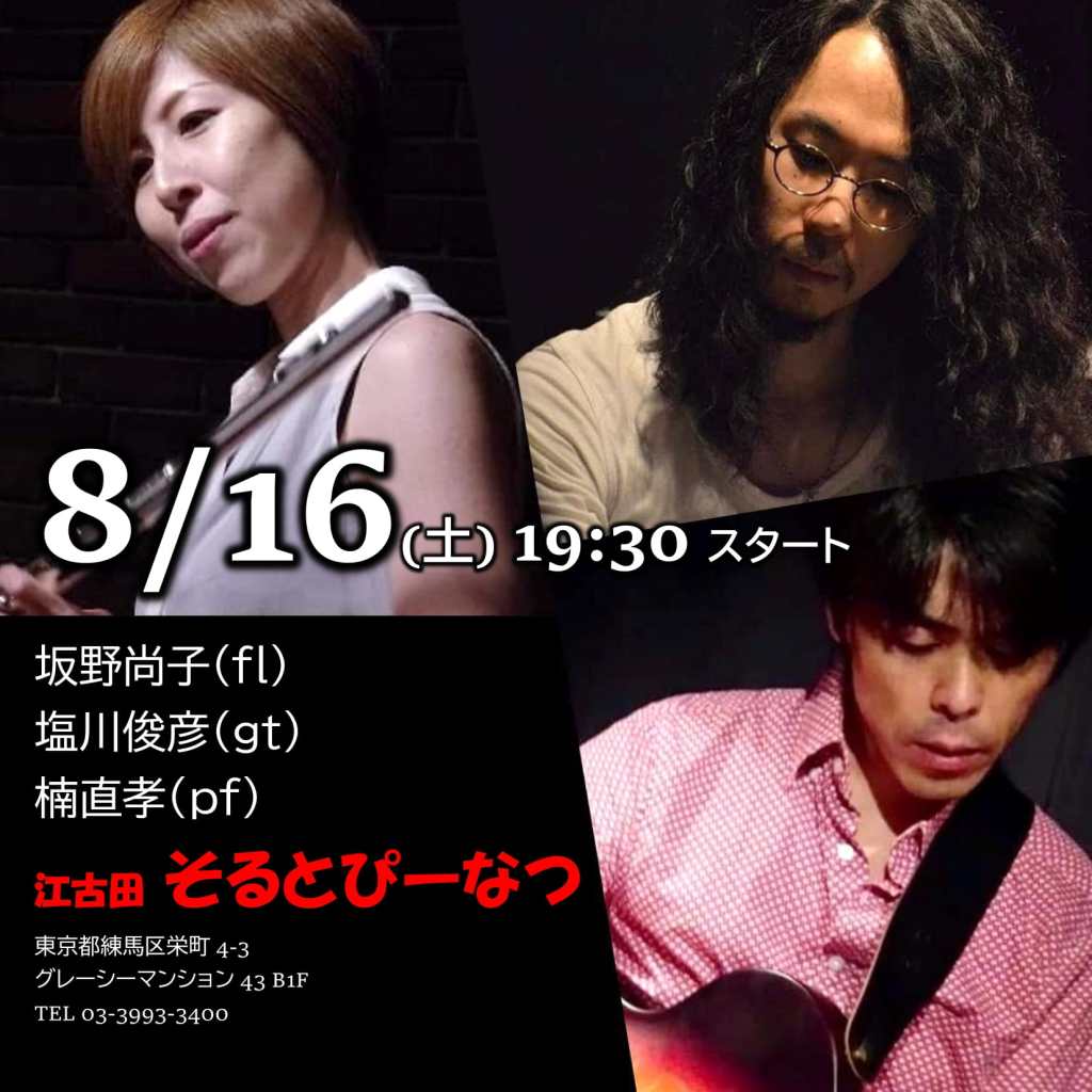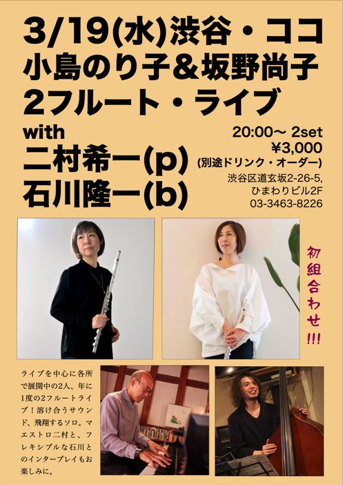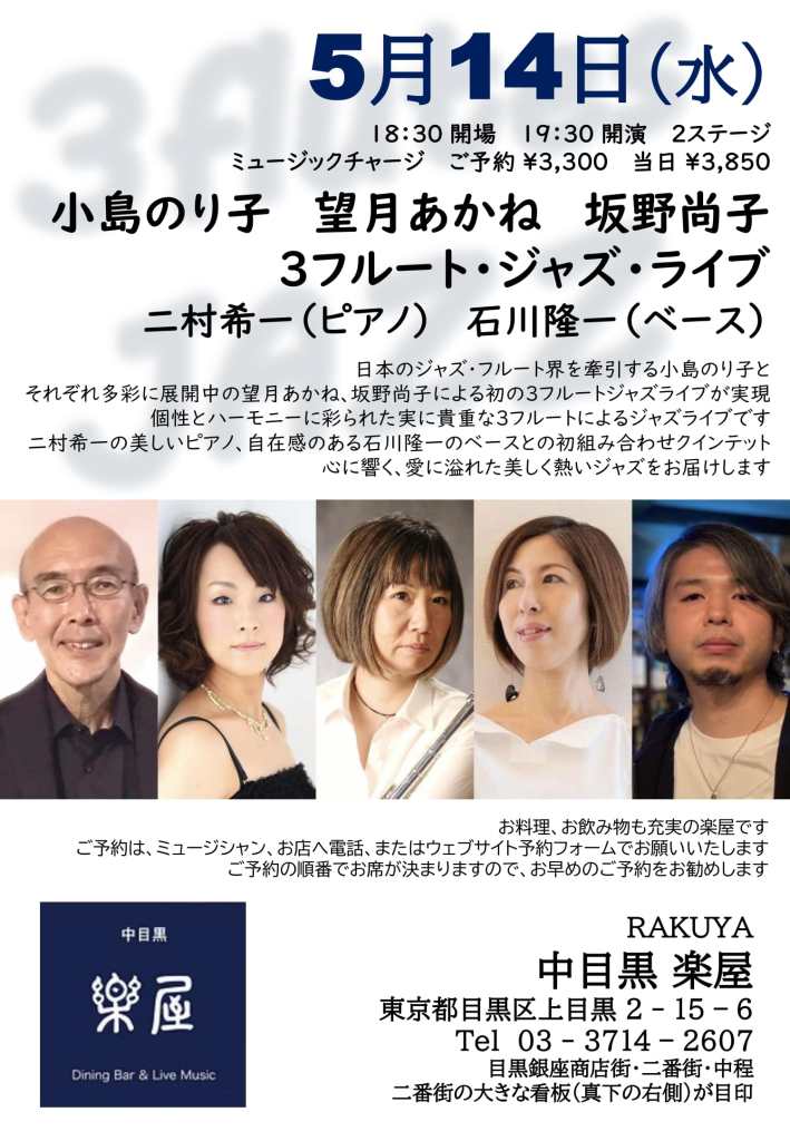 5月14日(水) 中目黒『楽屋』 ☆☆☆3フルートジャズライブ☆☆☆ 18:30オープン 19:30スタート 2ステージ MCご予約¥3300 当日¥3850 小島のり子(fl) 望月あかね(fl) 坂野尚子(fl) 二村希一(pf) 石川隆一(b) 東京都目黒区上目黒 2 – 15 – 6 電話 03 – 3714 – 2607https://www.rakuya.asia/ 小島のり子さんとの2フルートライブを7年?8年?ほど続けておりますが、3フルートはやらないの?やりたいね!なんて話題がちらほら出始めたここ数年、、、、とうとう実現します!! 記念すべき初の3フルートジャズライブです 私は楽屋さんへの出演も初!! 小島のり子さんの元門下生でもある望月あかねさんと私。こんなふうにみんなでライブをする日が来るとは 感慨深いものです それぞれの個性もアンサンブルも楽しんでいだけるライブ、そしてバンドメンバーの演奏も最高にかっこよくて痺れます ご予約はメンバーまたはお店まで。ご予約順にお席が決まっていくそうなのでぜひお早めに!!