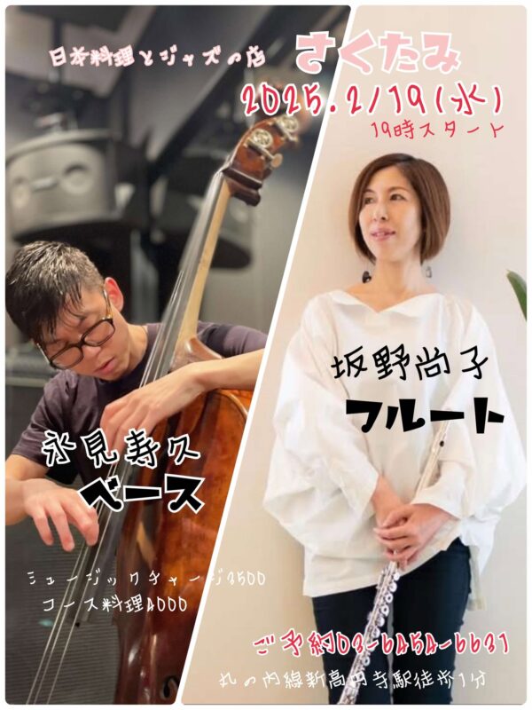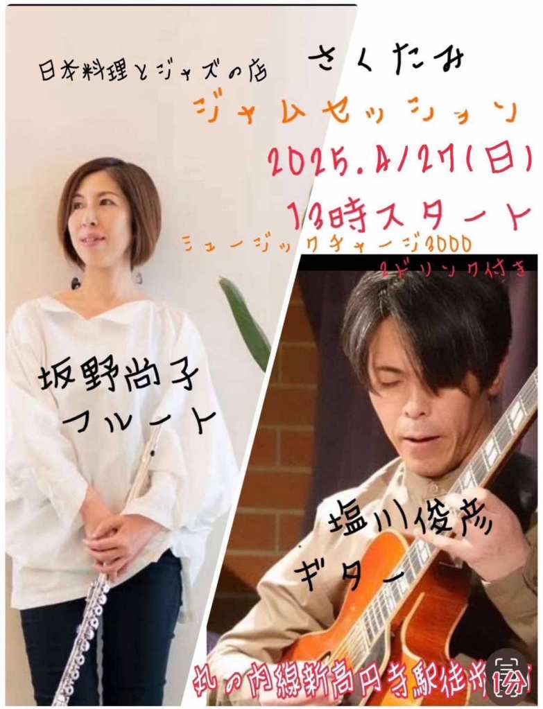 4月27日(日) 新高円寺『さくたみ』 ★ジャムセッション★ 13:00スタート 17:00くらいまで 参加費¥3000(2ドリンク付き) 塩川俊彦(gt) 坂野尚子(fl) 東京都杉並区梅里1-7-14 電話 03-6454-6631https://sakutami.com/ 毎月の恒例になってきました! 普段はとても美味しい日本料理のコースをいただきながらジャズライブをたのしめる、ともて素敵なお店さくたみさんお昼間のセッションのホストを務めさせていただきます! 毎度和気藹々と和やかなセッションながら、演奏はギュッと良い感じでやらせていただいておりますドラムセットは無いのですが、カホンはあります。ウッドベース、アップライトピアノあります。ボーカルさんのご参加ももちろん大歓迎です! 初めての方もどうぞお気軽に、ぜひのご参加お待ちしております