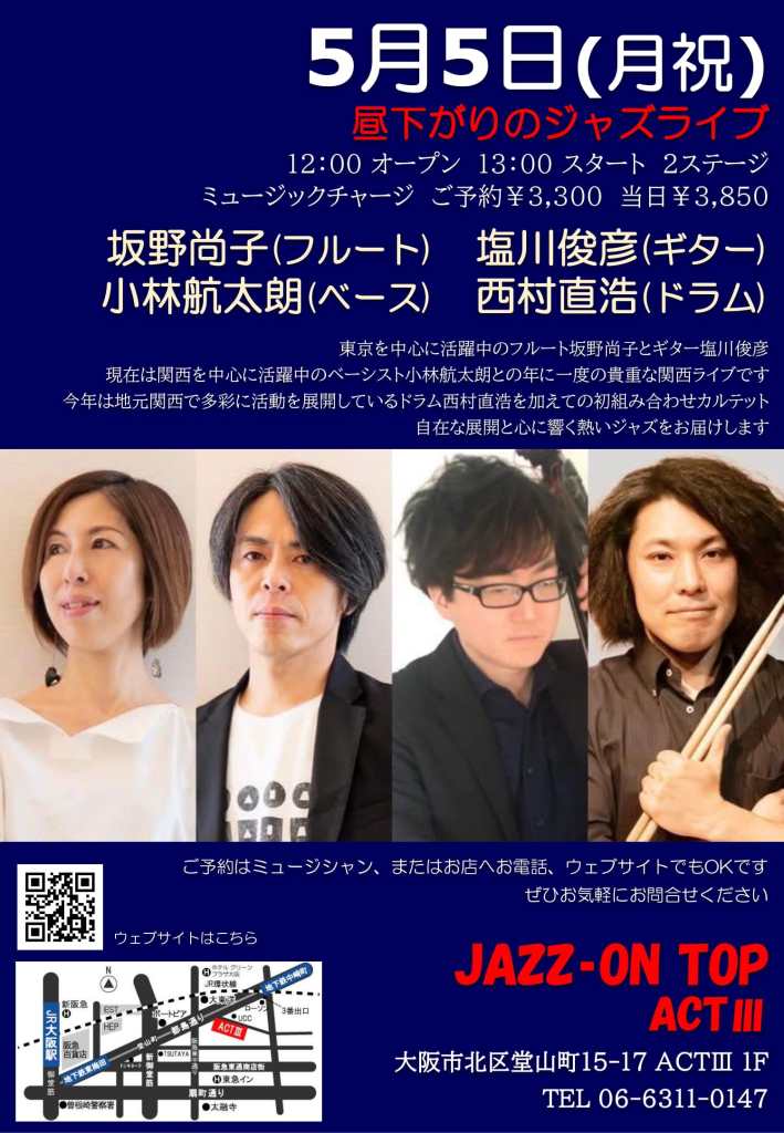 5月5日(月・祝)昼 大阪梅田『Jazz On Top ACTⅢ』 12:00オープン 13:00スタート MCご予約¥3300 当日¥3850 坂野尚子(fl) 塩川俊彦(gt) 小林航太朗(b) 西村直浩(dr) 大阪市北区堂山町15-17 ACTⅢ 1F 電話 06-6311-0147https://jazzontop.info/ 昨年も一昨年も、GWに大阪に旅行中の皆さまも含め足を運んでいただき感謝でした! 今年は地元大阪で大活躍中のドラム・パーカッションの西村直浩さんにも加わっていただき、カルテットでお届けします 今年はお昼間のジャズライブです スタンダードジャズもちょっとハードなジャズメンオリジナルも、ラテンジャズもやろうかなぁと、メンバーの顔を思い浮かべながらワクワクしております 年に一回の関西ライブです!!初組み合わカルテット!! ぜひご予定ください