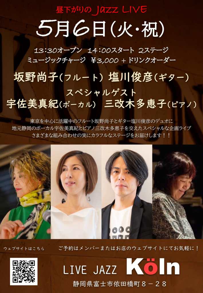 5月6日(火・祝)昼 静岡富士『Live Jazz Köln』 13:30オープン 14:00スタート MC¥3000+ドリンクオーダー 坂野尚子(fl) 塩川俊彦(gt) スペシャルゲスト 宇佐美真紀(vo) 三改木多恵子(pf) 静岡県富士市依田橋町8−28 電話 0545-52-0468https://kolnjazz.wixsite.com/mysite GWの音楽旅、超久しぶりに富士のケルンにてライブします 数々の素晴らしいミュージシャンの音魂が染み込んだ、日本屈指の最高に「ジャズ」なライブハウスケルン お店を、ミュージシャンを、お客様を、愛をもって育てたマスターの想いがギュッと詰まった場所 心に触れる音をぜひ体感してください 塩川さんとのデュオをベースに、宇佐美真紀さんと三改木多恵子さんに加わっていただきいろいろな組み合わせのステージをお届けします 真紀ちゃんと多恵さんとの共演も本当に久しぶり!!4人での演奏は初組み合わせ!! 静岡の皆さまと久しぶりにお会いできるのも楽しみです ぜひご予定くださいませ