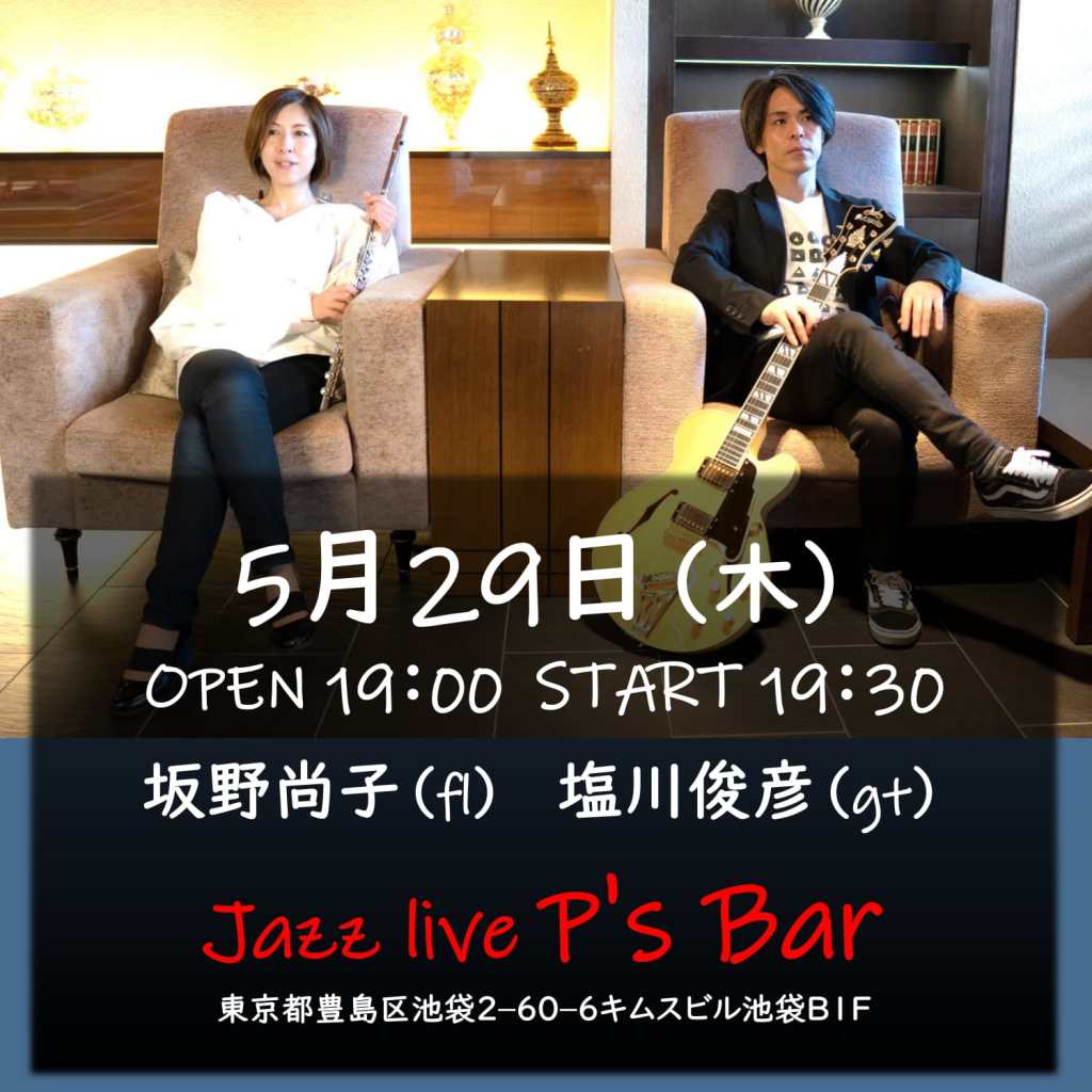 5月29日(木) 池袋『P’s Bar』 19:00オープン 19:30スタート 2ステージ MC¥3000 坂野尚子(fl) 塩川俊彦(gt) 東京都豊島区池袋2−60−6 キムスビル池袋B1F 電話 03-6709-4509https://psbar.net/top お馴染み超レギュラーな塩川さんとのデュオライブ✨ いろいろなバンドの演奏でもご一緒させていただいておりますが、完全デュオの定期ライブはここでの演奏のみ!! コンパクトな空間でフルートは完全生音でお届けしています。生音でがんがん吹けるのは私もとっても嬉しい😆 お客様との距離も近く、会話を交えながら毎度わいわい楽しく和やかなライブです😊 デュオならではの音の会話も絡みも目の前でバッチリ楽しんでいただけると思います!! ぜひご来店ください✨